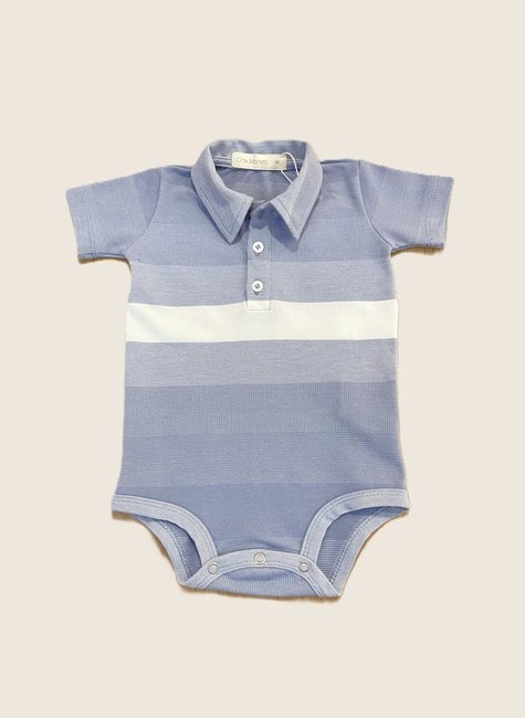 Body polo bebê em malha piquet, com listras largas em azul e off white. Modelo com manga curta, gola clássica bico e abertura frontal por botões. Possui fechamento no entrepernas com botões de pressão, garantindo praticidade e conforto no vestir. Uma peça que não pode faltar no guarda roupa do bebê para combinar com calças, shorts e jardineiras.