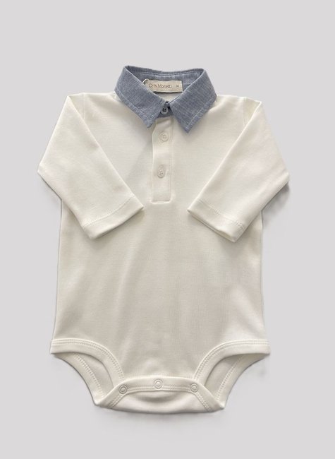 - Manga longa, Abertura frontal com botões, gola bico em tricoline azul, entrepernas com botões de pressão