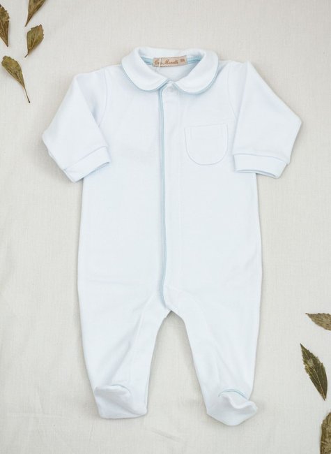 Esse macacão para bebê é confeccionado em malha suedine 100% algodão fio Egípcio, um tecido muito macio e confortável. Em tom branco com delicado viés azul claro, a peça possui gola redonda, mangas longas com punho, pezinhos fechados e um charmoso bolsinho decorativo no peito. A abertura frontal e no entrepernas com botões de pressão facilita na hora de vestir e trocar o bebê. Clássico e elegante, é uma escolha perfeita para compor o enxoval com muito conforto e estilo.