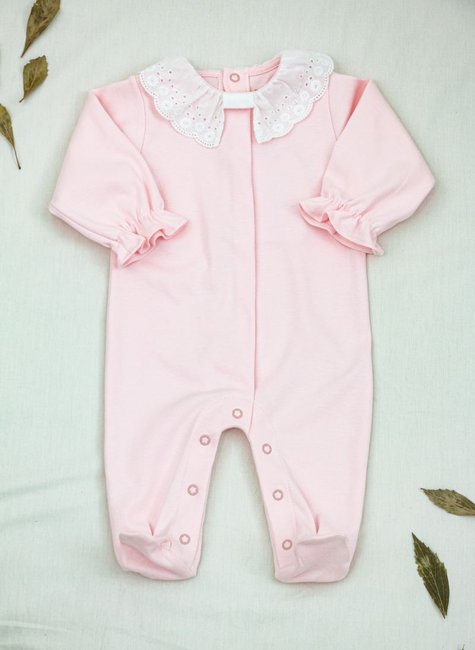 Macacão rosa bebê em malha suedine 100% algodão fio Egípcio, um tecido muito macio e confortável. Com delicada gola tipo laço em bordado inglês, prega frontal e mangas longas levemente bufante com elástico no punho. Botões de pressão nas costas e no entrepernas. Macacão com pé.