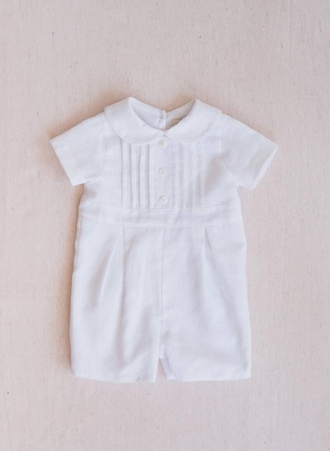 A cambraia de linho é a escolha perfeita para ocasiões especiais como batizados, casamentos e aniversários, combinando beleza, conforto e tradição. O macaquinho em cambraia de linho apresenta um design clássico e elegante. Possui gola arredondada com acabamento delicado e mangas curtas. A parte frontal conta com pregas verticais e três botões centrais para um detalhe sofisticado. A cintura é levemente marcada, dando estrutura ao modelo, enquanto a parte inferior apresenta pregas discretas para um caimento suave. Na parte de trás, o fechamento é feito com pequenos botões alinhados, garantindo praticidade e um visual refinado