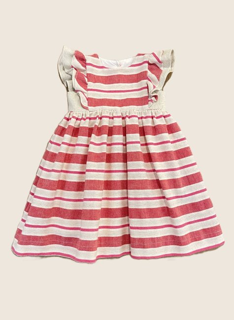 Vestido bebê listrado em vermelho e off white, confeccionado em tecido leve e macio, perfeito para dias mais frescos. O modelo sem mangas possui babados diplo ao redor do ombro, recorte na cintura que proporciona caimento rodado e fechamento na parte de trás por botões. Acompanha tampa fralda no mesmo tecido, garantindo um visual harmonioso e cheio de charme. Peça versátil, ideal para passeios, encontros em família ou até ocasiões especiais, unindo conforto e estilo clássico.