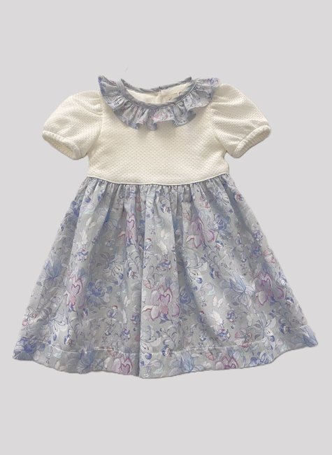 Encantador vestido bebê com corpo em malha de tricot no off white e saia em tricolne com estampa floral Liberty. Possui gola babado também em tricoline, mangas curtas levemente bufantes com elástico e abertura nas costas por botões. Acompanha tampa fralda no mesmo tecido do corpo para um look delicado e confortável.