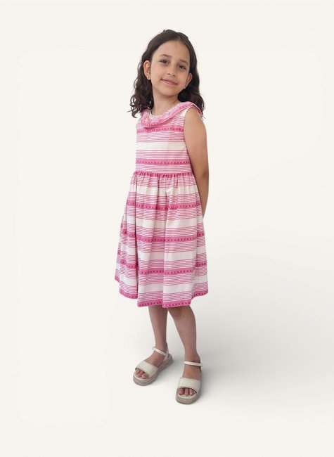 Encantador e cheio de delicadeza, este vestido infantil é confeccionado em tecido leve, com listras em tons de rosa e cru, criando uma composição suave e atemporal. O modelo se destaca pela gola com babados, que emoldura os ombros e se estende pelas costas em um elegante decote em V, trazendo charme na medida certa. O fechamento por botão na cintura garante praticidade ao vestir, enquanto o laço aplicado adiciona um toque romântico e sofisticado à peça. A saia levemente rodada proporciona movimento, conforto e liberdade para acompanhar a criança em todos os momentos. Uma peça versátil e especial, perfeita para ocasiões especiais.